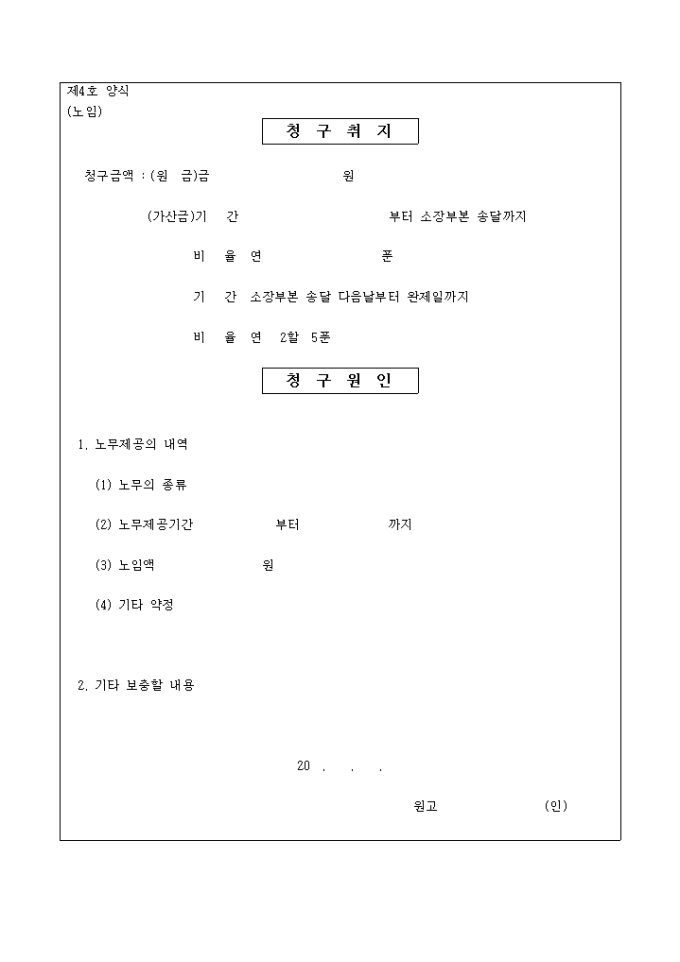 9,000원/월청구금액 및 노무제공의 내역을 기록하고 완제일까지의 기간과 비율을 적용하는 노임소장 양식입니다.