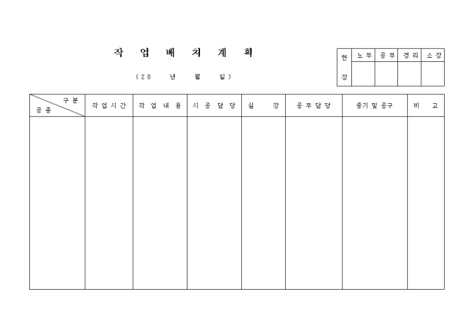 작업 배치 계획양식입니다. 작업시간, 작업내용, 시공담당, 실장, 공무담당, 중기 및 공구, 비고 등을 기재합니다.