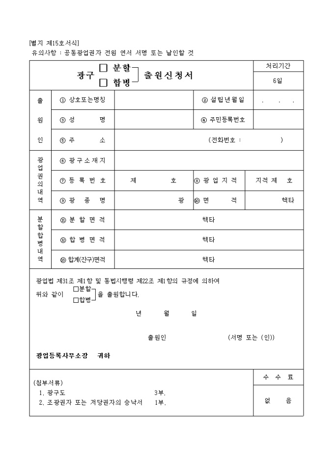 9,000원/월제31조 제1항 및 동법시행령 제22조 제1항의 규정에 의하여 위와같이 (분할, 합병)을 출원하고자 할 때 사용하는 "광구(분할,합병) 출원 신청서 광업법" 양식입니다.