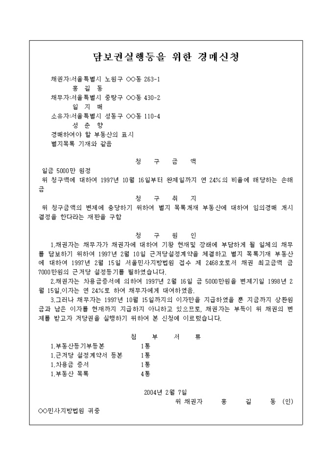 9,000원/월청구금액의 변제에 충당하기 위하여 별지 목록개재 부동산에 대하여 임의경매 개시결정을 한다라는 재판을 구하는 내용의 경매신청서 양식입니다.
