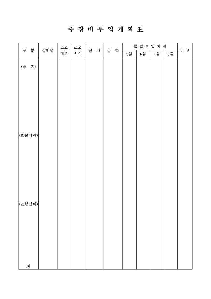 중장비 투입 계획서 양식입니다. 장비명, 소요 대주, 소요 시간, 단가, 금액, 월별 투입예정, 비고 등을 기재합니다.