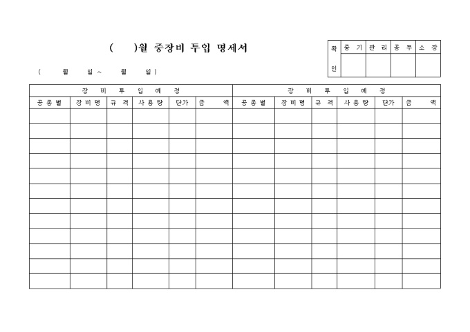 9,000원/월중장비 투입 명세서 양식입니다. 장비 투입 예정(공종별, 장비명, 규격, 사용량, 단가, 금액), 장비투입 예정(공종별, 장비명, 규격, 사용량, 단가, 금액)등을 기재합니다.