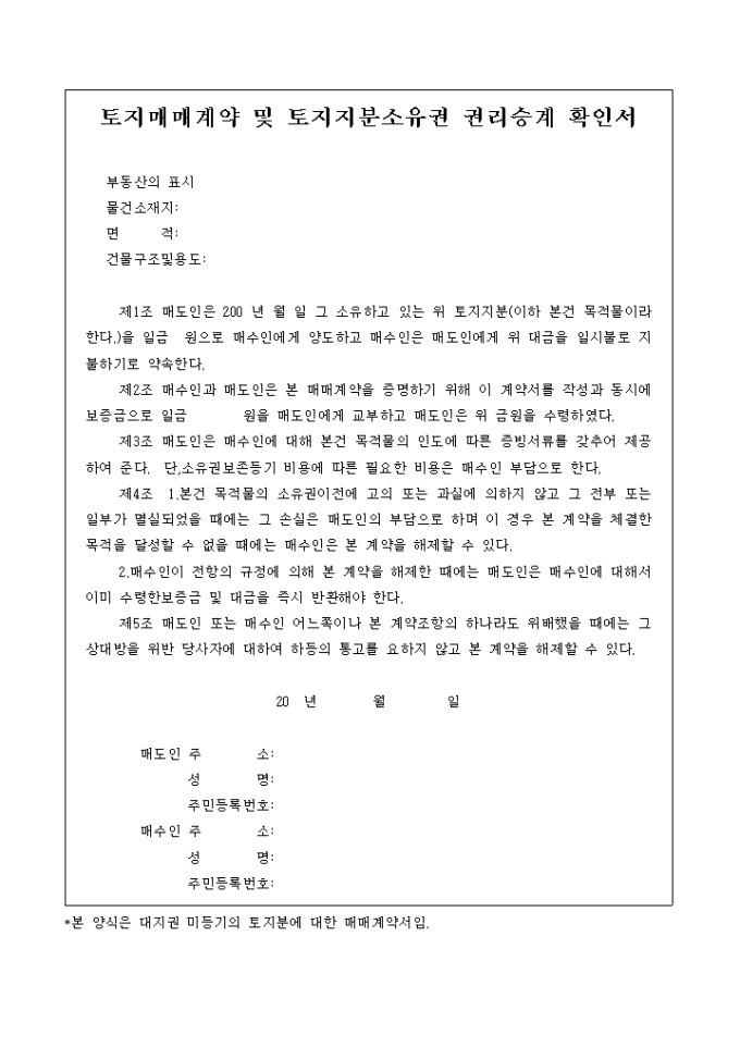 5개의 조항으로 이루어진 토지매매 계약 및 토지지분소유권 권리승계 확인서입니다.