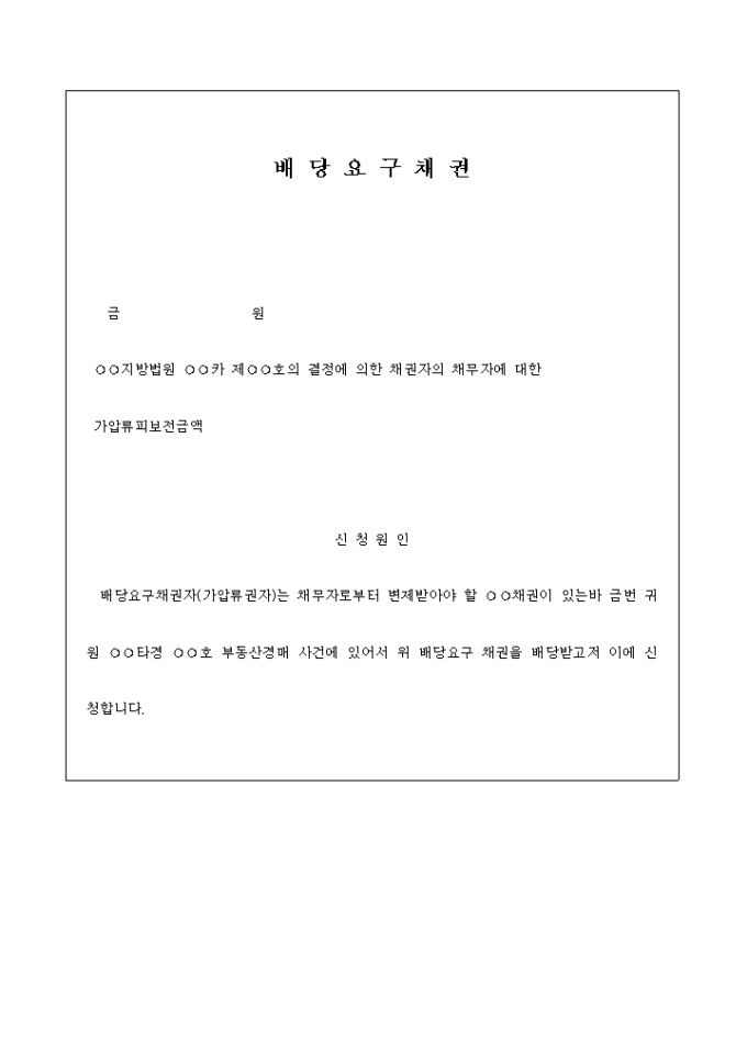 배당요구채권자(가압류권자)는 채무자로부터 변제받아야 할 채권이 있어 부동산경매 사건의 배당요구 채권을 배당요청하는 배당요구신청서의 예입니다.