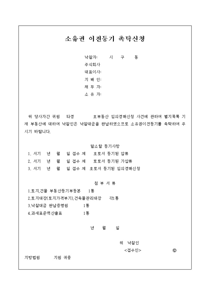 9,000원/월부동산 임의경매신청 사건에 관하여 낙찰대금을 완납하여 소유권이전등기 촉탁 요청을 하는 소유권이전등기 촉탁신청서입니다.