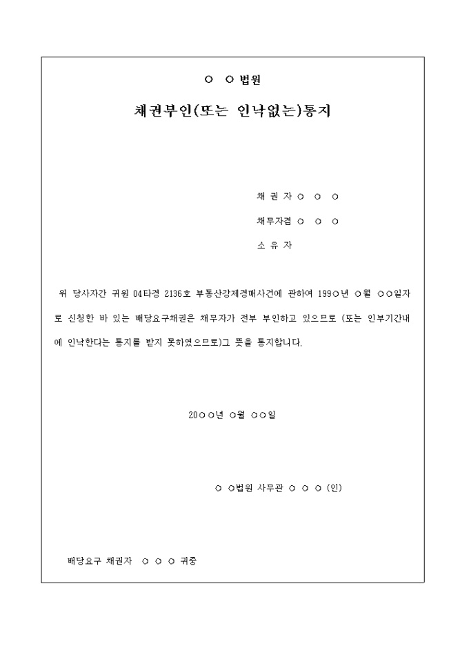 부동산강제경매사건에 관하여 채무자가 배당요구채권을 부인함을 통지하는 채권부인(또는 인낙없는)통지서입니다.