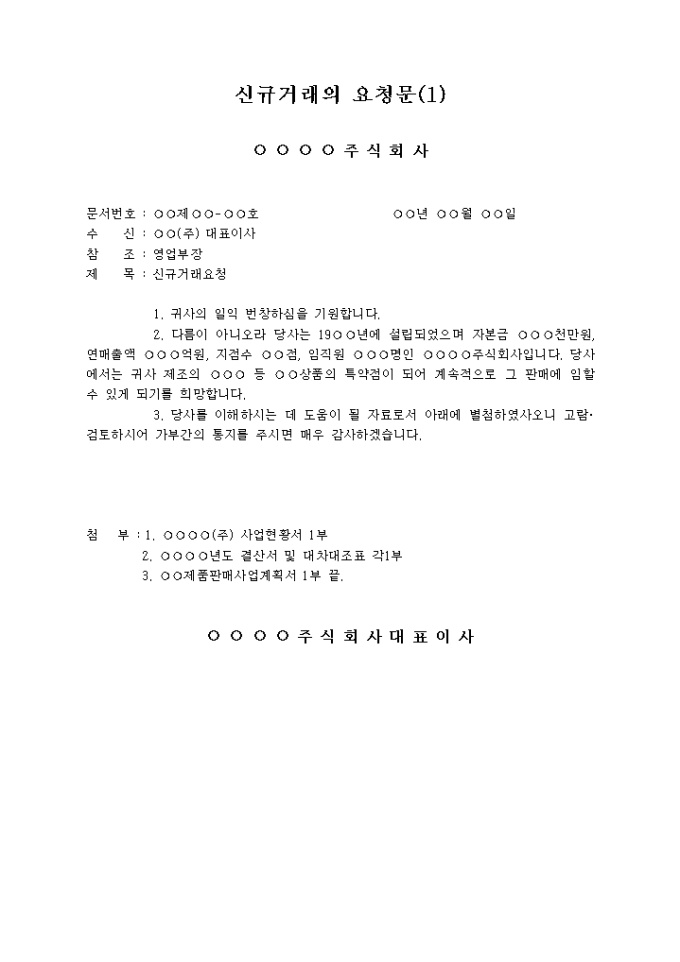 9,000원/월거래할 업체에 당사 제품을 알리고 자사의 자료를 별첨하여 , 거래할 것을 요청하는 신규거래 요청문입니다.