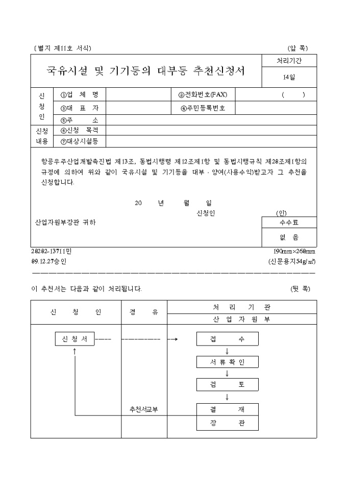 9,000원/월항공우주산업개발촉진법 제13조, 동법시행령 제12조제1항 및 동법시행규칙 제28조제1항의 규정에 의하여 위와 같이 국유시설 및 기기등을 대부․양여(사용수익)받고자 그 추천을 신청할 때 사용하는 "국유시설 및 기기등의 대부등 추천신청서" 양식입니다.
