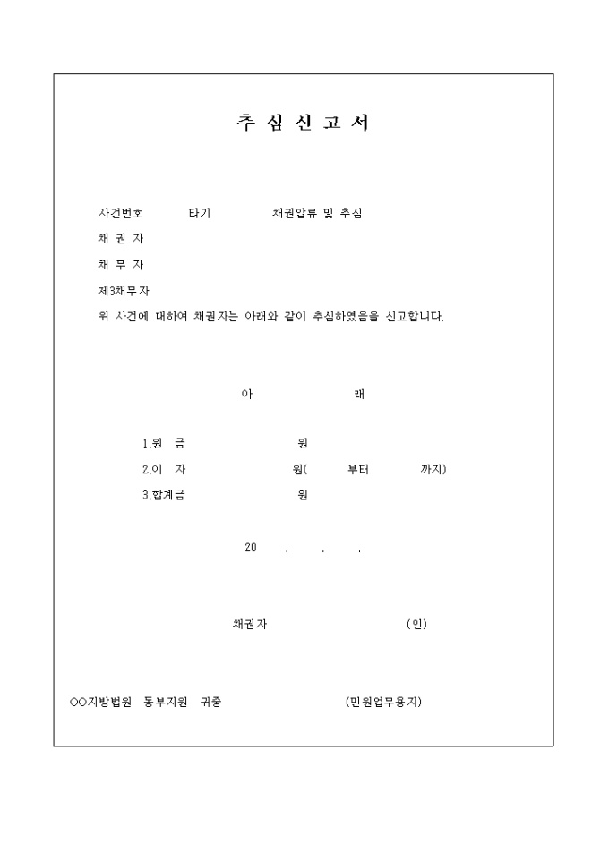 채권압류에 대한 원금, 이자, 합계금을 추심하는 추심신고서입니다.