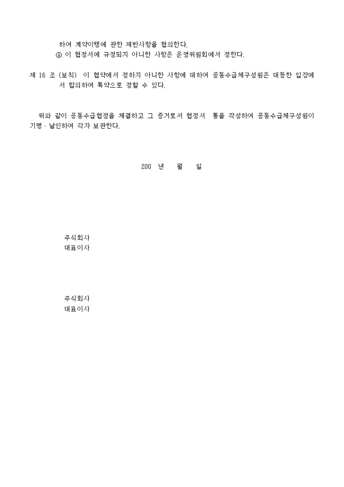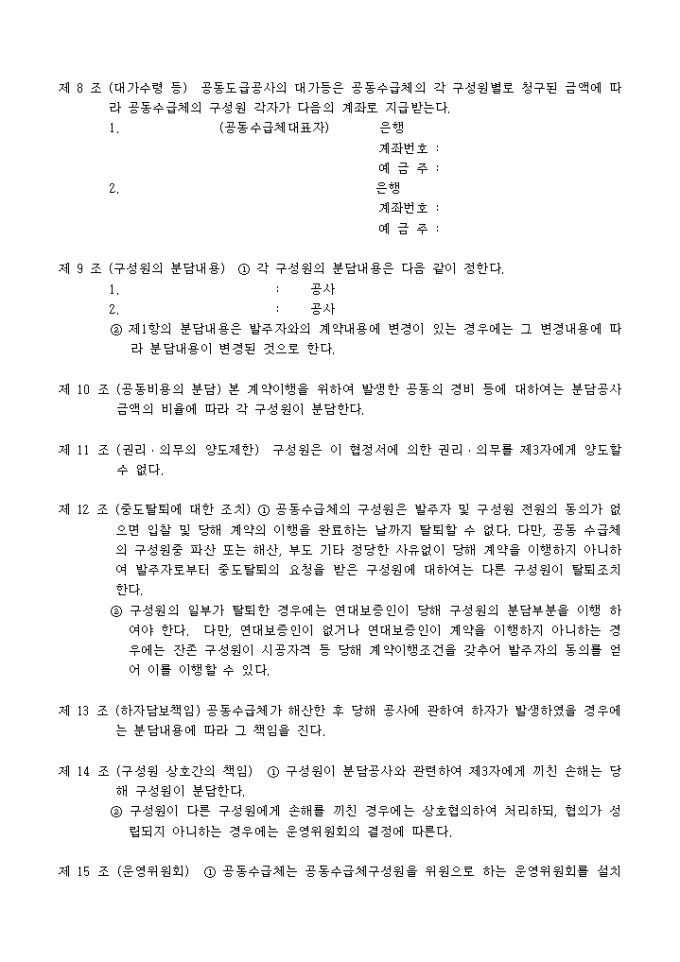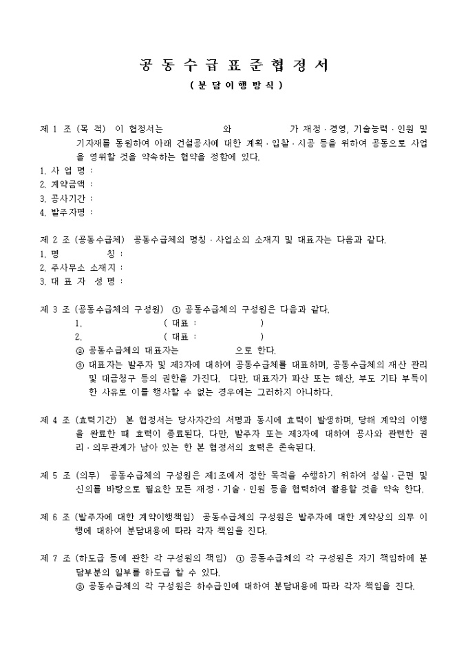 재정·경영, 기술능력·인원 및 기자재를 동원하여 아래 건설공사에 대한 계획·입찰·시공 등을 위하여 공동으로 사업을 영위할 것을 약속하는 협약을 정하는 공동수급표준협정서(분담이행방식) 양식입니다.
