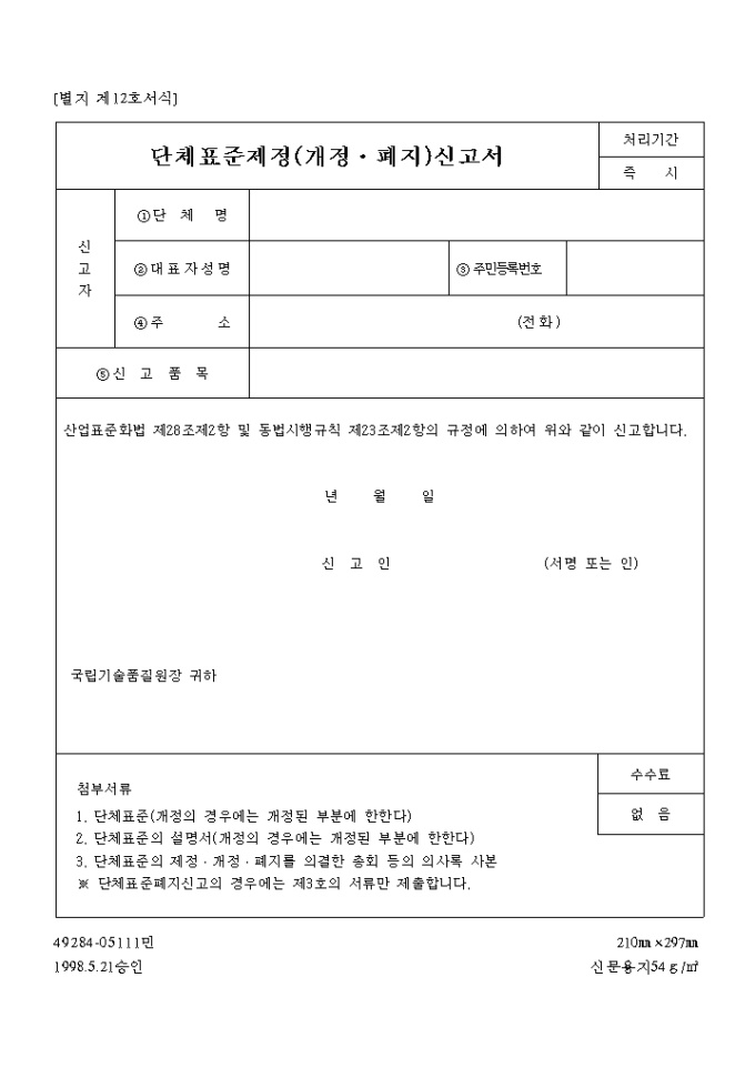 산업표준화법 제28조제2항 및 동법시행규칙 제23조제2항의 규정에 의하여 위와 같이 신고할 때 사용하는 "단체 표준제정 (개정,폐지)신고서" 양식입니다.