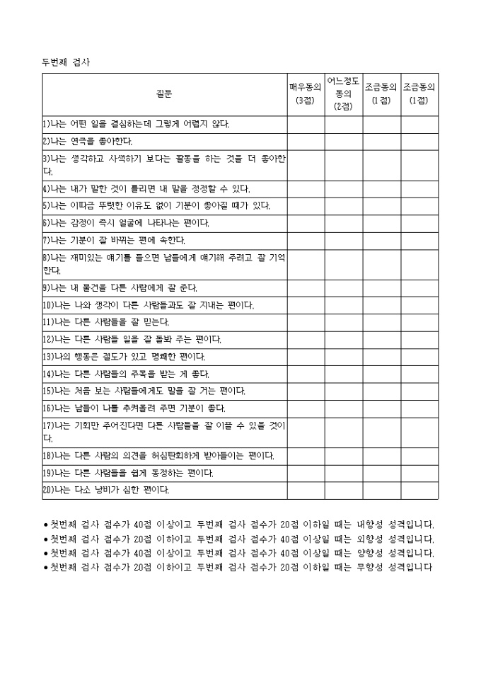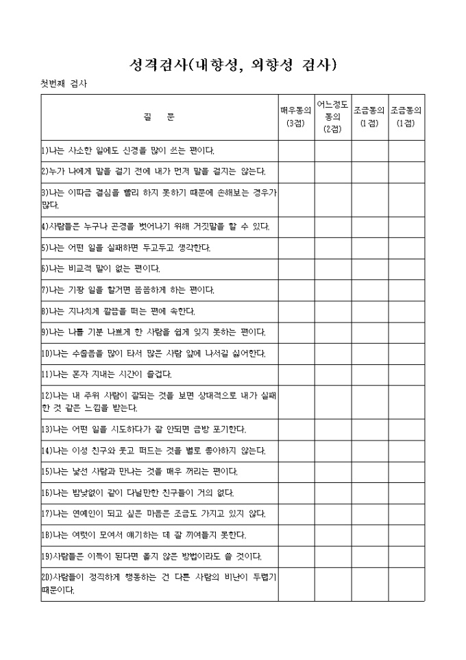 9,000원/월성격검사(외향적, 내향적)를 위해 실시한 설문입니다. 크게 2개의 질문(총 40개)을 하여 해당질문의 점수를 통해 성향을 파악합니다.