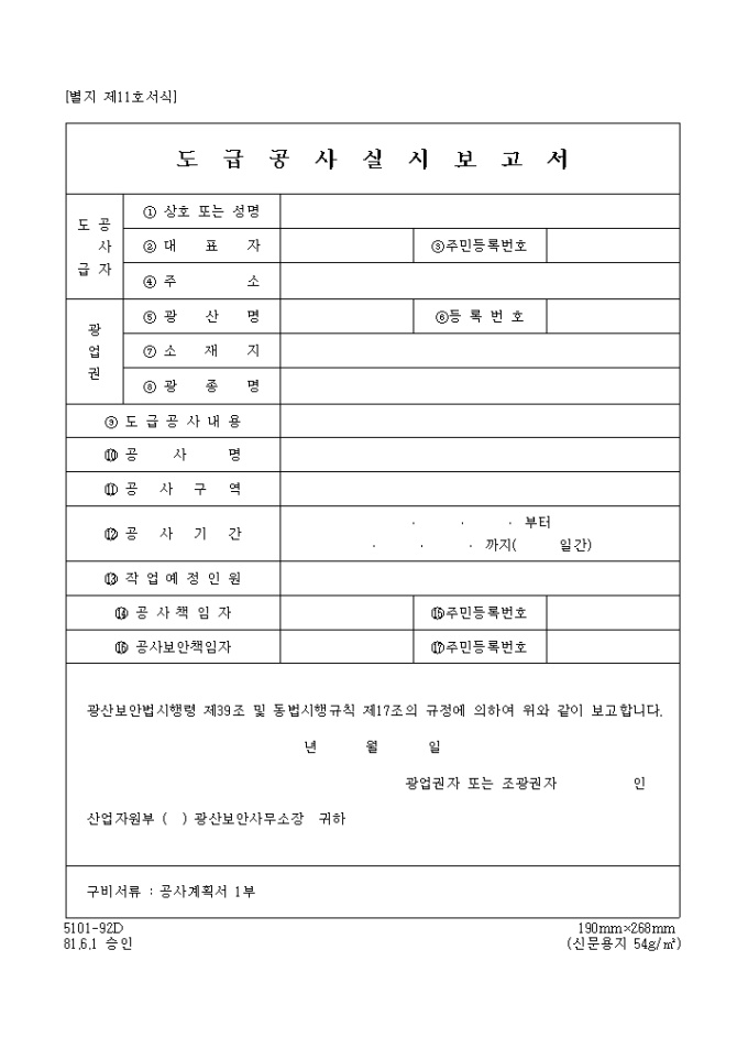 9,000원/월광산보안법시행령 제39조 및 동법시행규칙 제17조의 규정에 의하여 위와 같이 보고하고자 할 때 사용하는 "도급공사 실시보고서" 양식입니다.