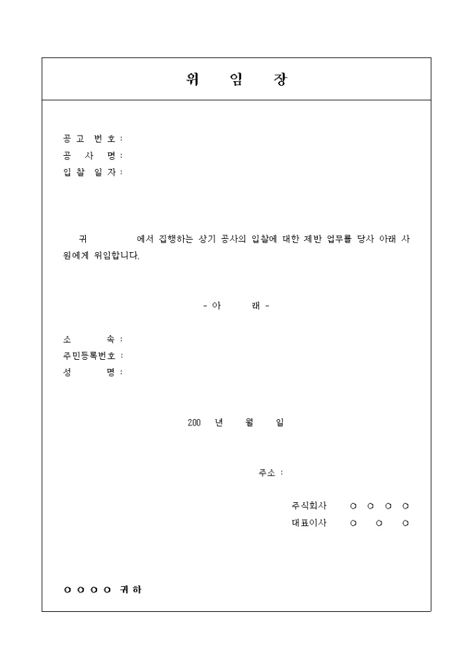 9,000원/월귀 회사에서 집행하는 상기 공사의 입찰에 대한 제반 업무를 당사 아래 사원에게 위임하는 위임장(입찰등록) 양식입니다.