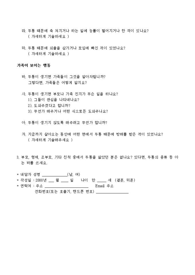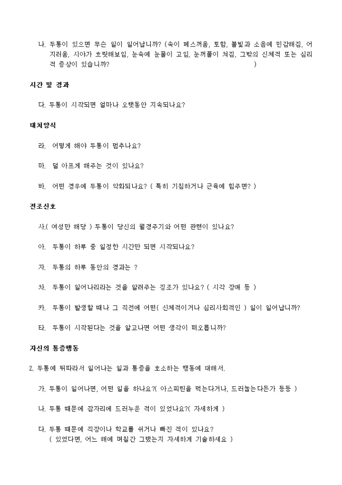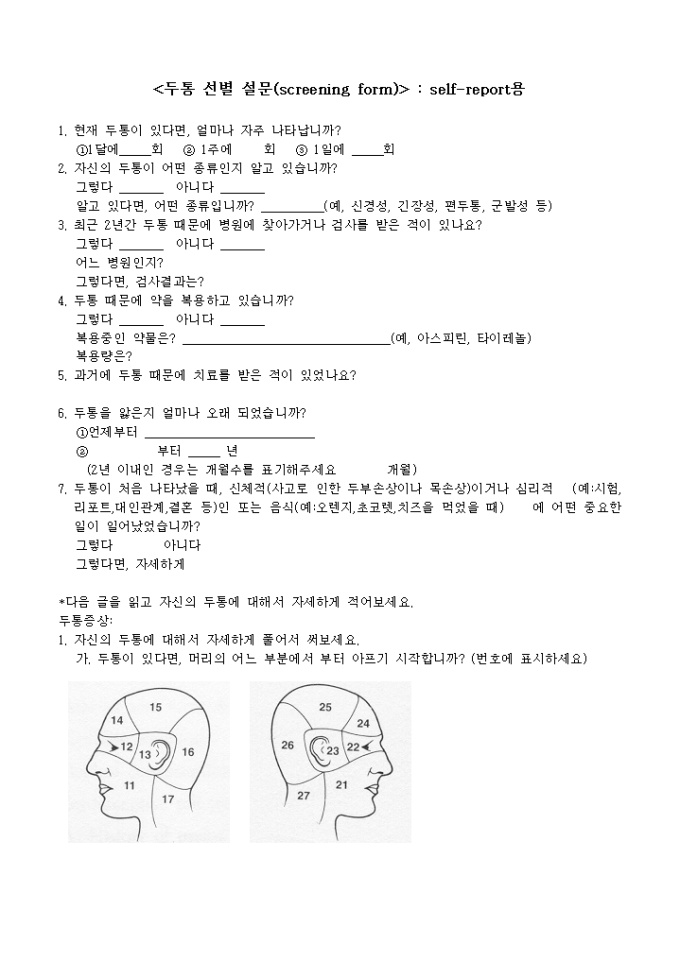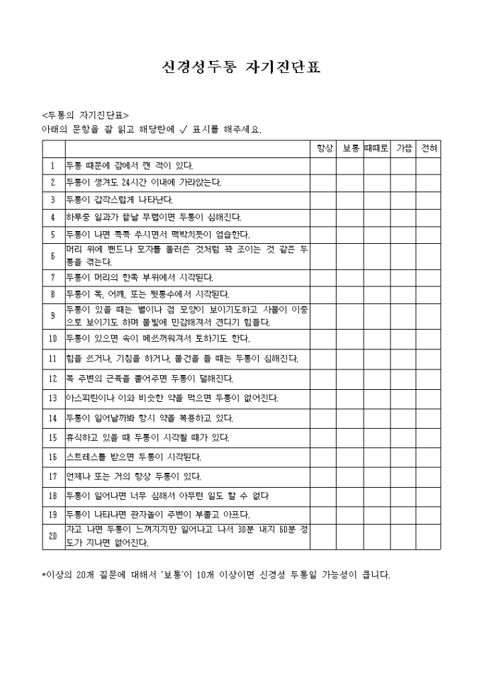 신경성 두통 자기진단표(20가지 항목)와 두통선별 설문으로 나누어져있습니다.