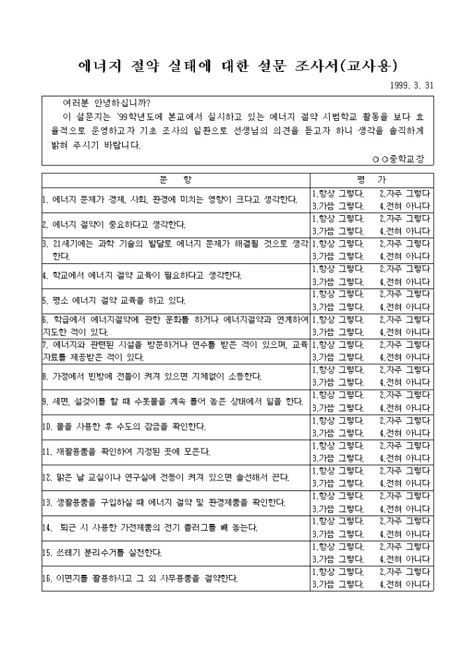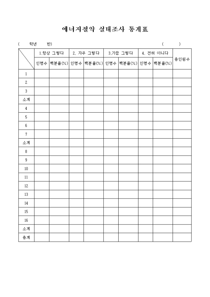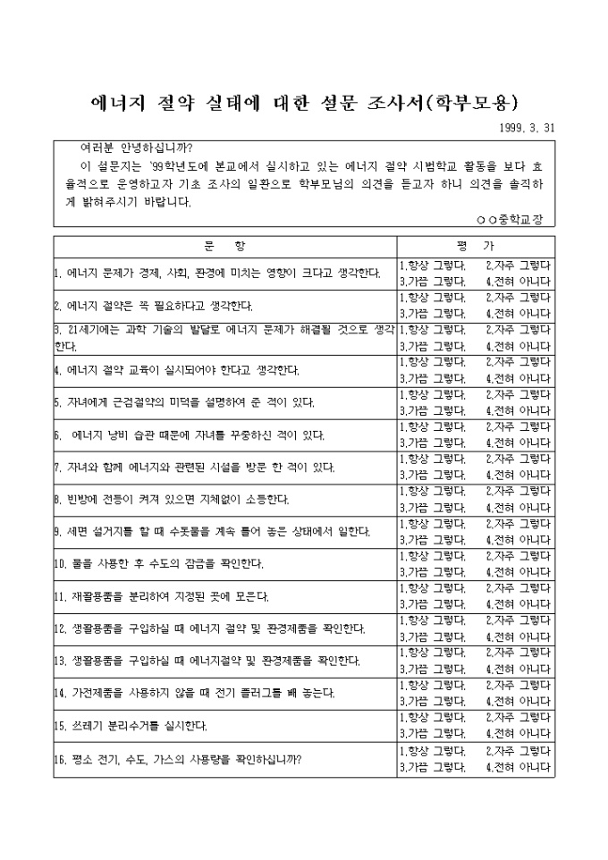 9,000원/월에너지 절약 실태에 대한 설문 조사서입니다. 학생용과(16개 문항) 학부모용(16개 문항), 교사용(16개문항), 에너지 절약 실태조사 통계표로 나누어져 있습니다.
