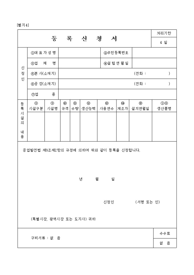 9,000원/월공업발전법 제9조제2항의 규정에 의하여 위와 같이 등록을 신청하고자 할 때 사용하는 "등록신청서" 양식입니다.