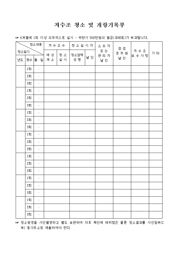 9,000원/월청소일시 별 저수조수, 청소실시자, 소유자 또는 관리자 날인, 점검공무원 날인, 저수조보수사항을 기록하는 저수조정수_및_개량기록부 양식입니다.
