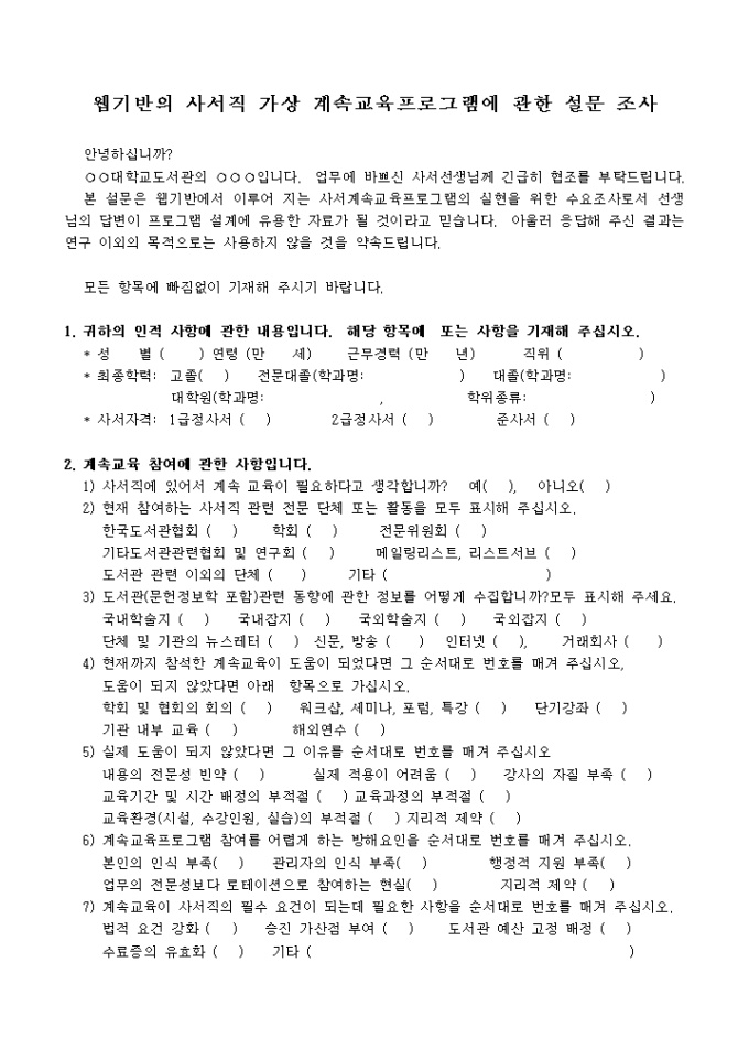 웹기반의 사서직 가상 계속교육프로그램에 관한 설문 조사입니다. 기본 인적사항과 계속교육 참여에 관한 사항 및 웹기반 가상교육의 활용 가능성에 관한 질문입니다.