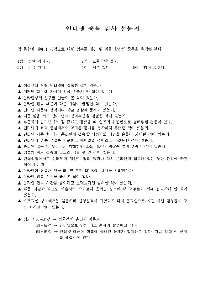 9,000원/월인터넷 중독에 관한 자가진단 검사 설문지 입니다. 각 항목별 점수를 매겨 총점이 일정이상이면 중독임을 판단합니다.