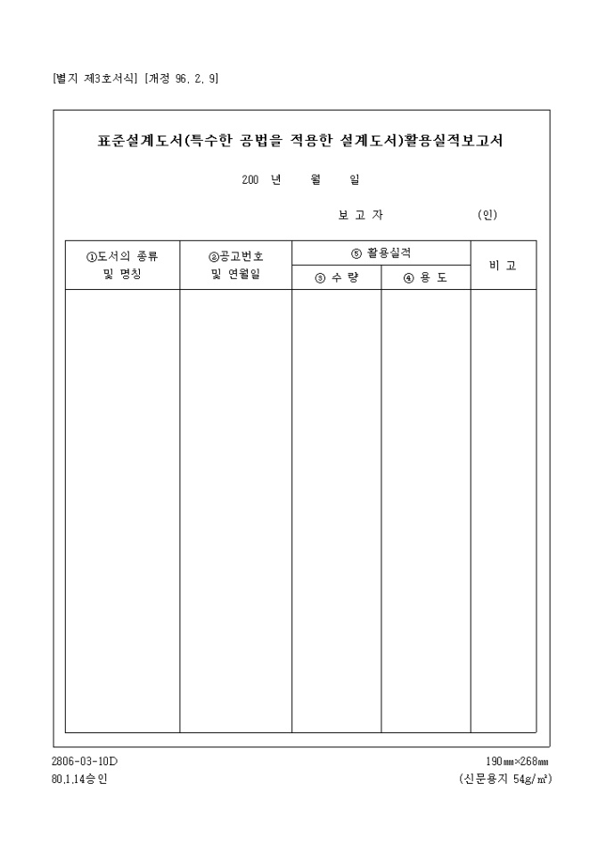 도서의 종류 및 명칭, 공고번호 및 연월일, 활용실적 등을 기록하여 보고하는 표준설계도서활용실적보고서 양식입니다.