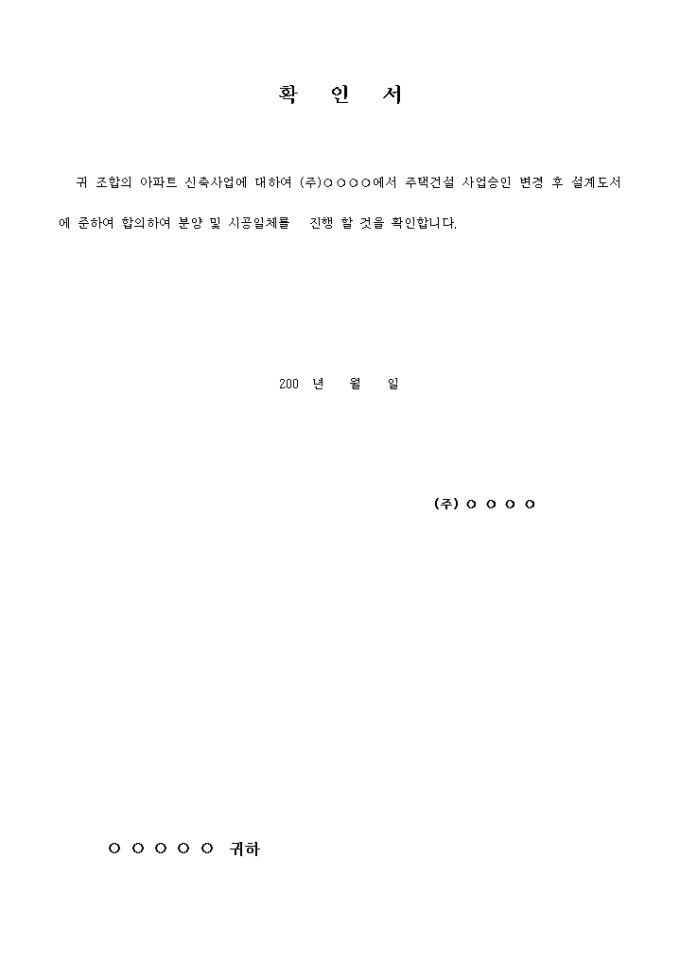 9,000원/월조합의 아파트 신축사업에 대하여 (주)○○○○에서 주택건설 사업승인 변경 후 설계도서에 준하여 합의하여 분양 및 시공일체를 진행 할 것을 확인하는 확인서(주택건설사업승인변경) 양식입니다.