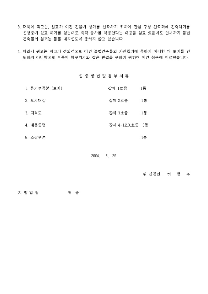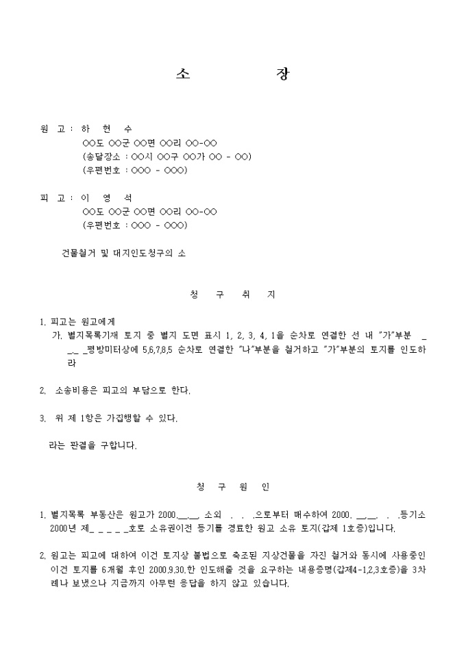 9,000원/월토지상 불법으로 축조된 지상건물을 자진 철거와 동시에 사용중인 토지를 인도하라는 청구취지의 소장(건물철거 및 대지인도)입니다.