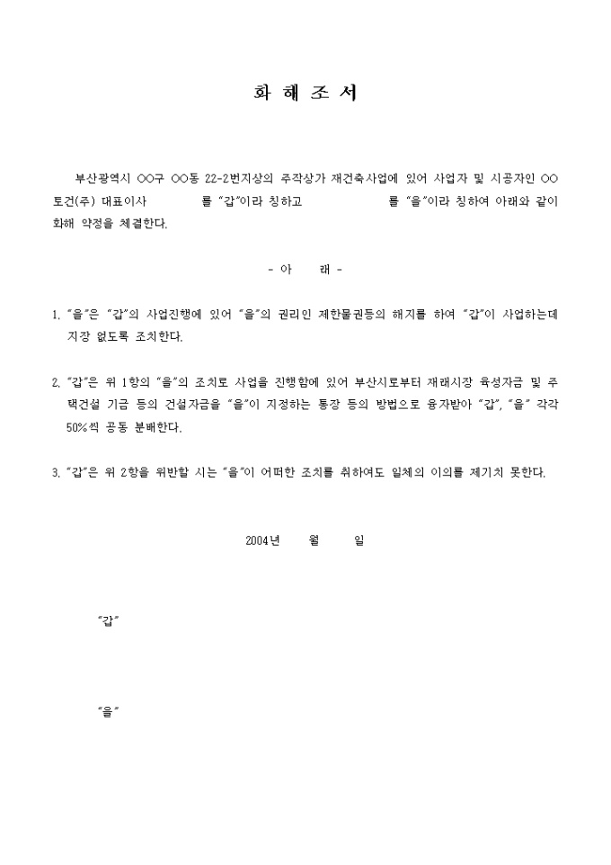 9,000원/월재건축사업에 있어 사업자 및 시공자와 부동산의 권리자와의 화해조서(재건축사업)입니다.
