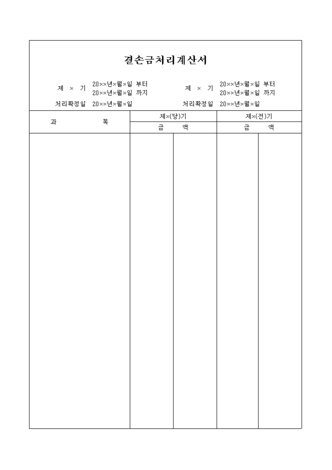 9,000원/월계정과목당 금액을 표기하는 결손금처리계산서 양식입니다.