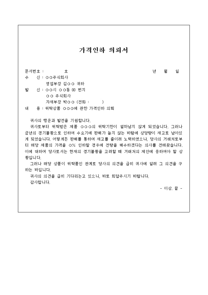 9,000원/월재고 제품을 할인 할 경우 재고제품 전량을 매수하겠다는 의뢰를 받아 위탁 받은 제품의 할인을 거래 업체에 의뢰하는 가격인하 의뢰서 입니다.