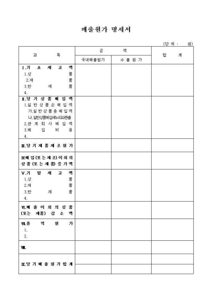 기초재고액, 당기상품매입액, 당기제품제조원가, 매입이외의 상품증가액, 기말재고액, 매출이외의 상품, 용역원가등의 계정과목에 대한 국내매출원가, 수출원가등을 기재하도록 되어있는 매출원가명세서 양식입니다.