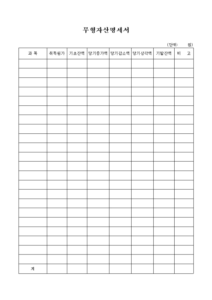 과목별 취득원가, 기초잔액, 당기증가액, 당기감소액, 당기상각액, 기말잔액등의 항목으로 구성된 무형자산명세서양식입니다