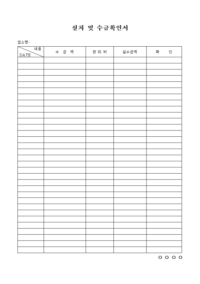 날짜별 수금액, 관리비, 실수금액, 서명등의 항목으로 구성된 설치 및 수금확인서양식입니다