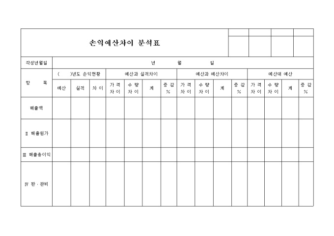 9,000원/월손익현황, 예산과 실적차이, 예산과 예산차이, 예산대 예산등의 항목별 매출액, 매출원가, 매출총이익, 판, 관비등의 항목으로 구성된 손익예산차이분석표 양식입니다.