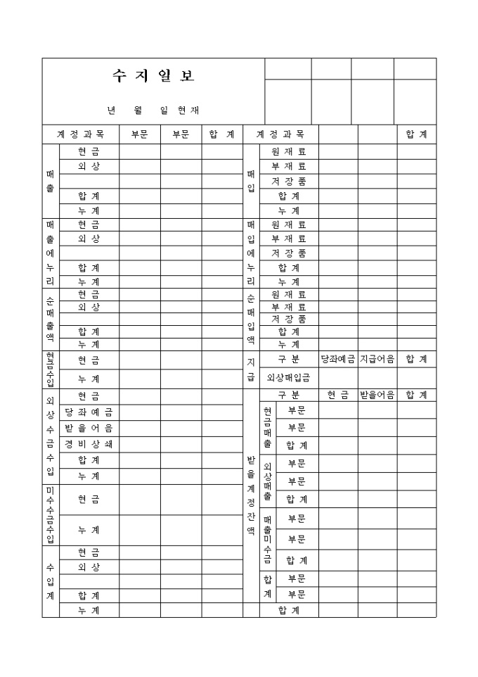 매출, 매출에누리, 순매출액, 현금수입, 외상수금수입, 미수수금수입, 수입계, 매입, 매입에누리, 순매입액, 지급, 받을계정잔액등의 항목으로 구성된 수지일보 양식입니다.