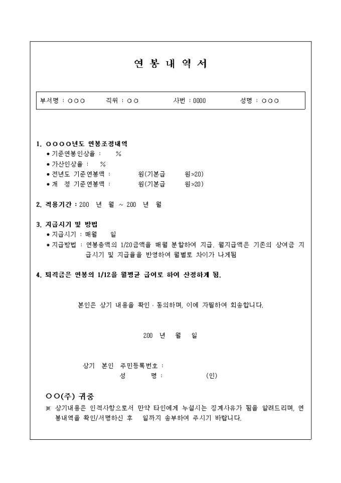 연봉의 조정내역, 적용기간, 지급시기 및 방법, 퇴직금 산정내역등을 기재하는 연봉내역서 양식입니다.