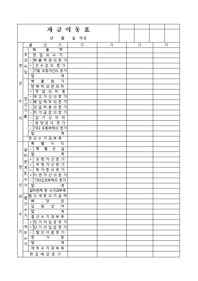 9,000원/월경상수지(경상수입, 경상지출, 경상수지과부족), 경상외수지(설비관계등수지, 결산수지, 개무수지, 현금예금증가)등의 항목으로 구성된 자금이동표 양식입니다.