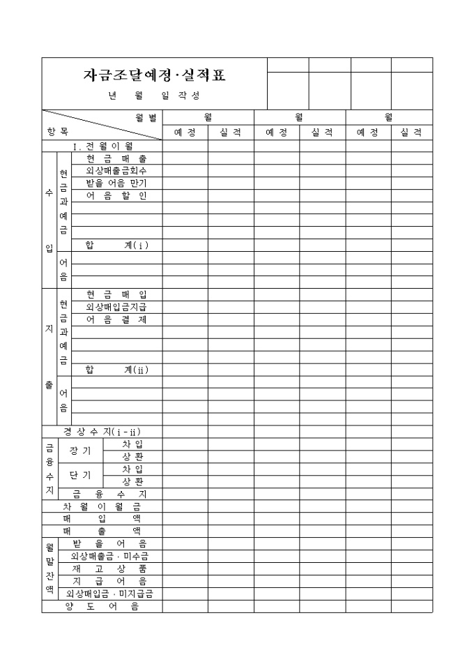 9,000원/월전월이월내역, 수입, 지출, 경상수지, 금융수지, 차월이월금, 매입액, 매출액, 월말잔액, 양도어음등의 내역을 우러별로 예정과 실적으로 표기하는 양식입니다.