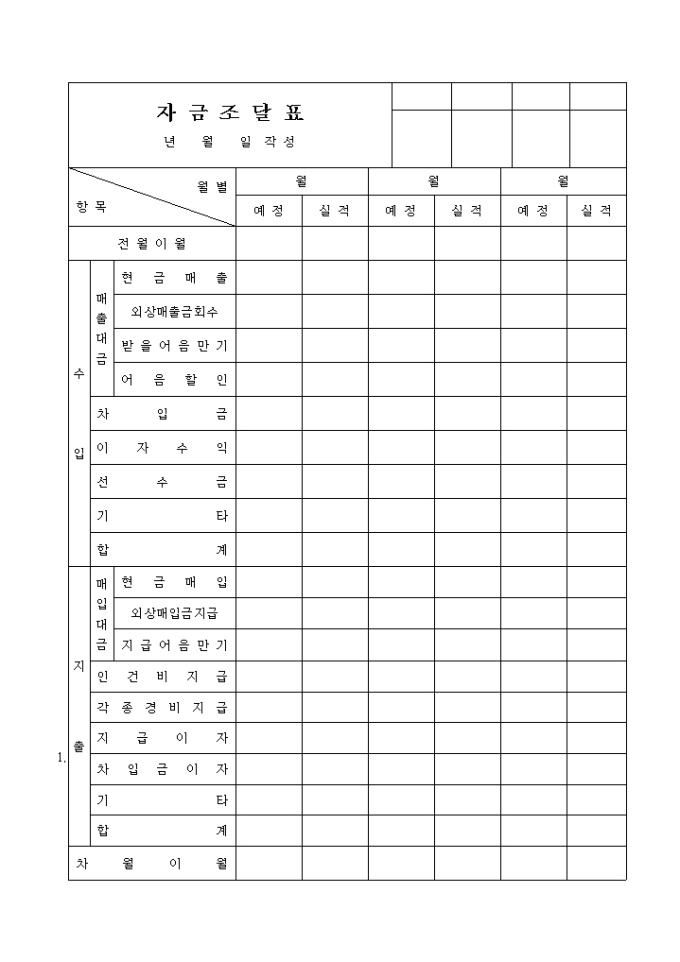 9,000원/월전월이월내역, 수입(매출대금, 차입금, 이자수익, 선수금등), 지출(매입대금, 인건비지급, 각종경비지급, 지급이자, 차입금이자등)의 항목들을 월별 예정과 실적으로 나누어 기록하는 자금조달표 양식입니다.