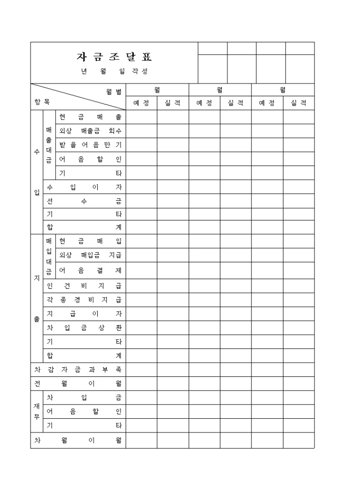 9,000원/월수입(매출대금, 수입이자, 선수금등), 지출(매입대금, 인건비지급, 각종경비지급, 지급이자, 차입금상황등), 차감자금과부족, 전월이월, 재무, 차월이월등의 항목을 월별 예정과 실적으로 기재하는 자금조달표 양식입니다.