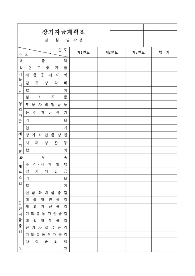 9,000원/월매출액, 각연도증가율, 가득자금, 경영자금, 재무지출, 과부족, 재무수입, 운전자금증감등의 항목으로 구성되어 영도별로 장기자금계획을 기록할 때 사용하는 양식입니다.