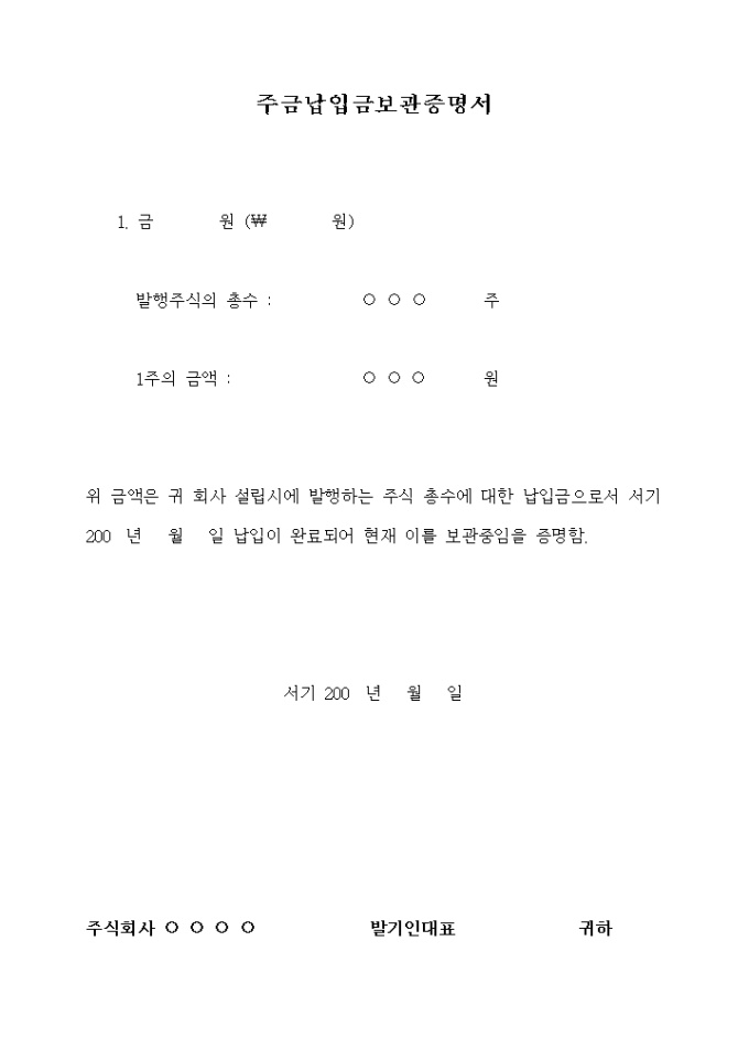 회사 설립시 발행하는 주식 총수에 대한 납입금이 완료되었고 현재 이를 보관함을 증명할때 사용하는 양식입니다.
