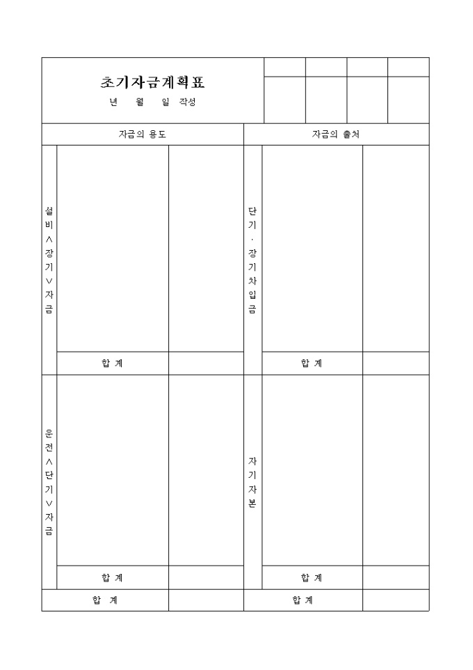 9,000원/월설비자금, 단기, 장기차입금, 운전자금, 자기자본등에 대해 자금의 용도 및 자금의 출처내역을 기재하는 초기자금계획표양식입니다.