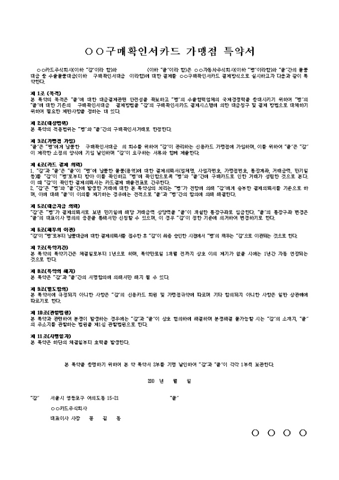 목적, 대상범위, 가맹점 가입, 카드결제의뢰, 대금지급의뢰, 채무의 이관, 특약기간, 특약의 해지, 별도합의 , 관할법원, 시행일자등 모두 11개 조항으로 구성된 카드가맹점 가입신청서 특약서양식입니다.