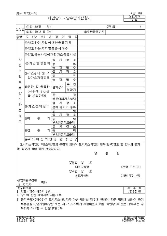 도시가스사업법 제6조제1항의 규정에 의하여 도시가스사업의 전부(일부)양도 및 양수의 인가를 받고자 위와 같이 신청하고자 할 때 사용하는 "사업양도, 양수 인가신청서" 양식입니다."