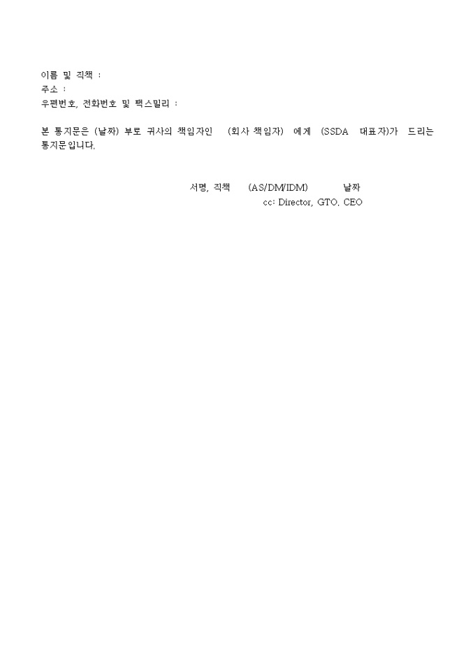 회사에 기재된 내역과 같이 검사중단 통지를 할 때 사용하는 양식입니다.