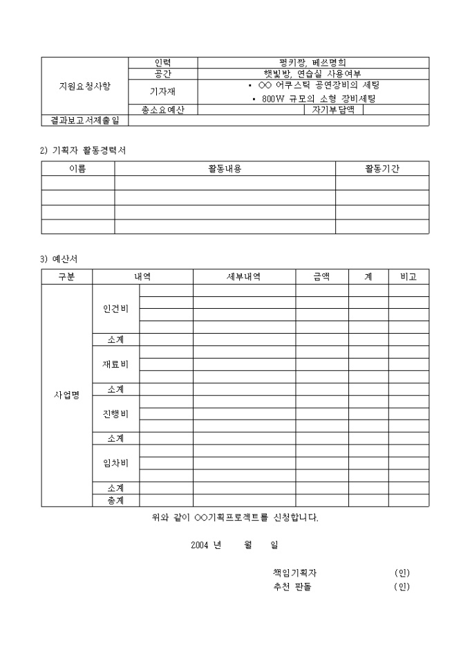 사업기획서, 기획자 활동경력서, 예산서등의 내역을 기재하는 기획프로젝트 신청양식입니다.