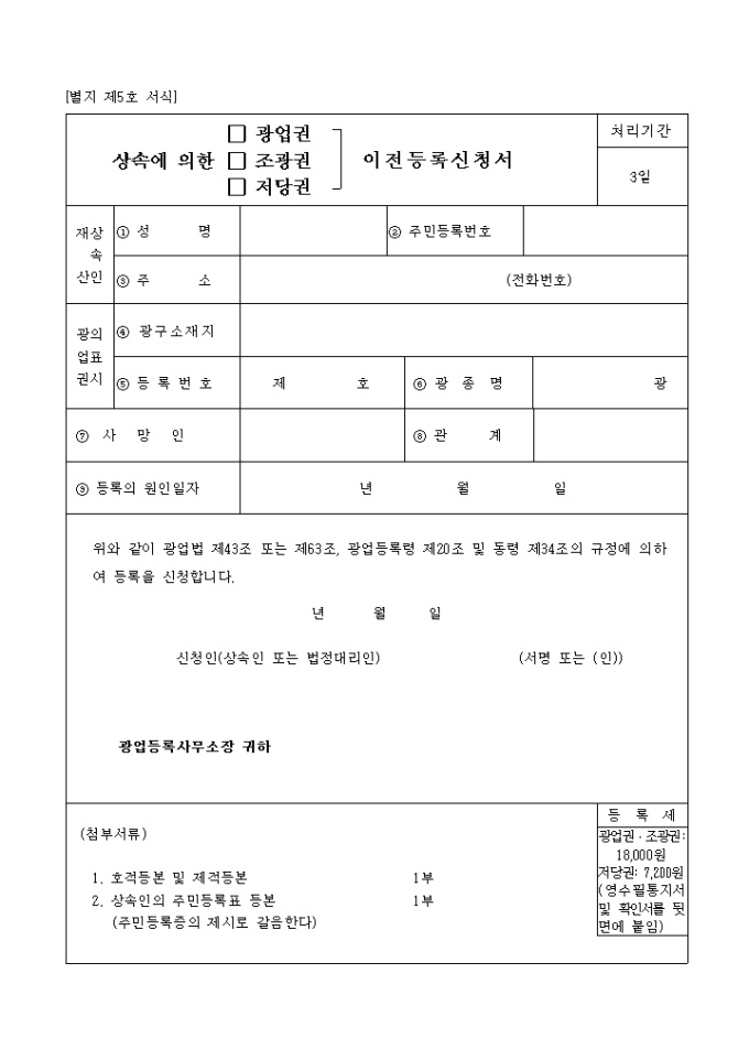9,000원/월광업법 제43조 또는 제63조, 광업등록령 제20조 및 동령 제34조의 규정에 의하여 등록을 신청하고자 할 때에 사용하는 "상속에 의한(광업권,조광권,저당권) 이전 등록신청서" 양식입니다.