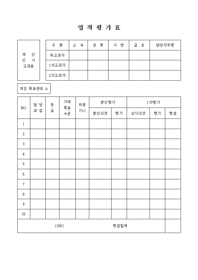 9,000원/월담당과업, 등급, 기대목표수준, 비중, 본인평가, 1차평가등의 항목으로 구성된 업적 평가표양식입니다.