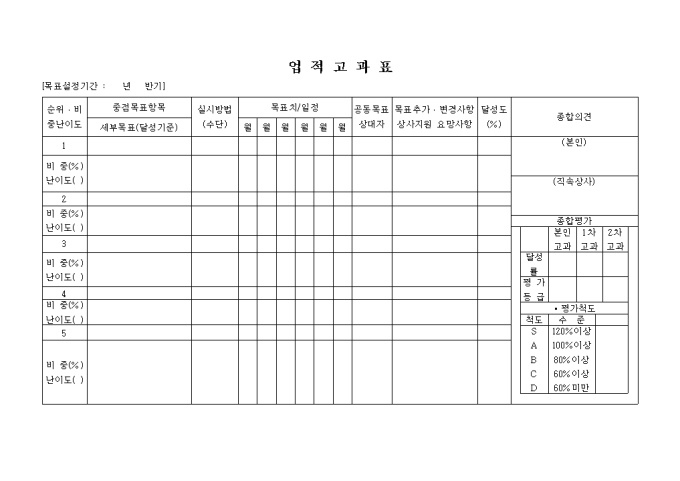 9,000원/월중점목표항목과 실시방법, 목표치일정, 공동목표 상대자, 목표추가.변경사항, 상사지원 요망사항, 달성도등의 항목으로 구성된 업적 평가표양식입니다.비중 및 난이도도 기록합니다.
